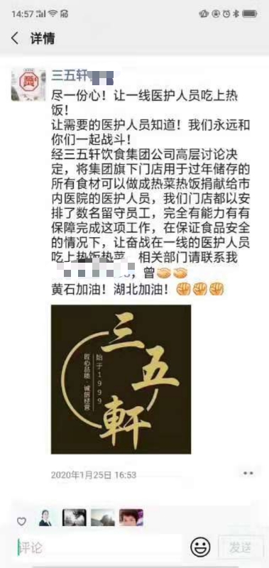 “让一线医务人员吃上热饭,让医务人员知道,我们永远和你们一起战斗……”1月25日,黄石市烹饪酒店行业协会会长及行业维权办公室主任、黄石三五轩饮食管理集团有限公司总经理曾文在朋友圈发了这样一段话,他还留下了自己的联系方式,让黄石本地的医疗机构与之联系。他介绍,这些盒饭食材都是各企业本来用于春节储备的,为给该市抗击新型肺炎防疫出一份力,企业在春节期间克服困难,召回放假员工留守,安排专门车辆消毒派送,是希望为奋战在一线的医护人员带去一份特别的温暖和力量!