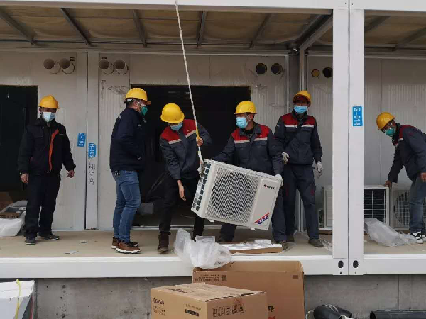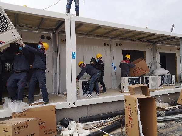 ▲安装工程师们正在火神山医院抢装空调